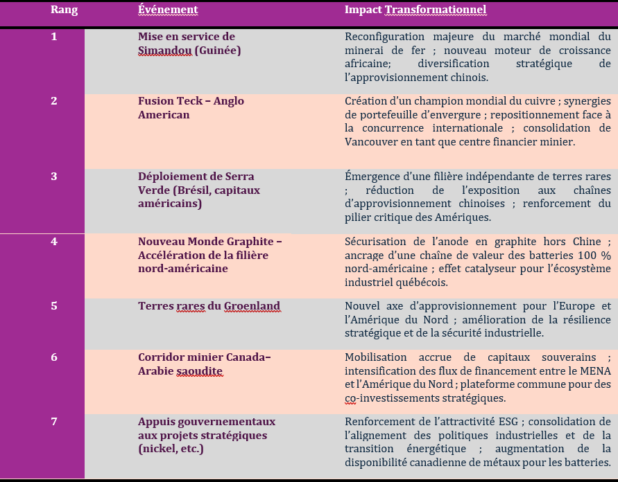 La volatilité réglementaire et les nouveaux mandats souverains—de la refonte du marché du carbone au Canada, à l’affirmation de la souveraineté sur les ressources en Afrique, et aux ajustements chinois du régime des contrôles à l’exportation, reconfigurent la cartographie des risques sectoriels. Les flux de capitaux stratégiques suivent désormais les juridictions conjuguant compétitivité réglementaire et effet de levier géoéconomique : repositionnement massif autour des métaux critiques et des batteries, rehaussement des incitatifs à l’exploration, multiplication des corridors d’affaires entre l’Amérique du Nord et les marchés émergents en Afrique (Rankin, 2025 ; Iragi, 2025). Les investisseurs institutionnels et les dirigeants d’entreprise ne considèrent plus les virages réglementaires comme des risques secondaires, mais comme des moteurs directs de la valorisation boursière, de la syndication et du volume des transactions.