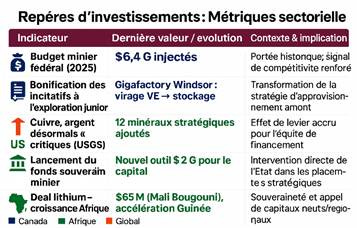 Le secteur minier mondial connaît un tournant décisif, porté par une relance budgétaire d’ampleur inédite, une intervention accrue de l’État, ainsi qu’une accélération stratégique de la doctrine de « sécurité d’approvisionnement ». Le budget minier du gouvernement canadien (6,4 G$) et la création d’un fonds souverain envoient des signaux compétitifs majeurs, refaçonnant les anticipations du marché et incitant à la révision, par les investisseurs institutionnels, des arbitrages fiscaux sur les minéraux critiques, le montage financier des projets et la résilience des chaînes de valeur intégrées (Hidayat, 2025 ; Tomesco & McClelland, 2025). Ces leviers budgétaires déclenchent une vague de repositionnements corporatifs et d’opérations de fusions-acquisitions, en témoignent le rapprochement stratégique entre Anglo American et Teck et la redirection accélérée des flux de capitaux vers la chaîne d’approvisionnement des batteries (McGee & Willis, 2025 ; Friedman, 2025).